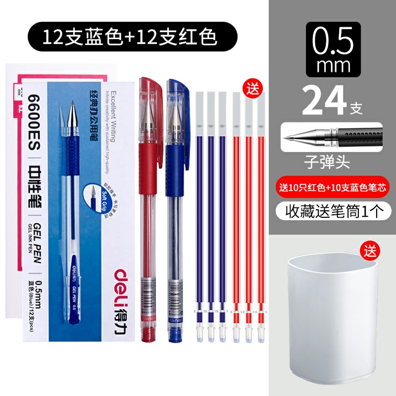 12支紅色+12藍(lán)色-得力文具中性筆學(xué)生用黑色0.5mm子彈頭水筆藍(lán)紅簽字筆批改筆記賬筆辦公用品書寫工具碳素筆50/12支裝